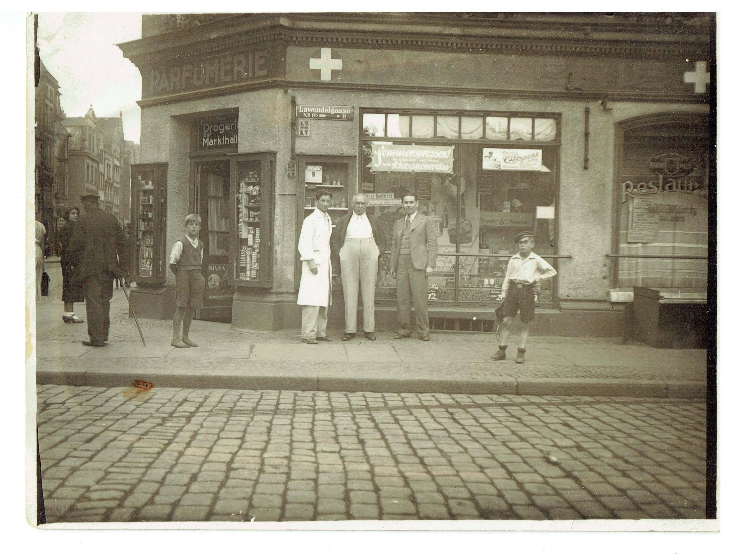 - Photo of a group of men outside a Pharmacy on Lawendelgasse st. in Danzig