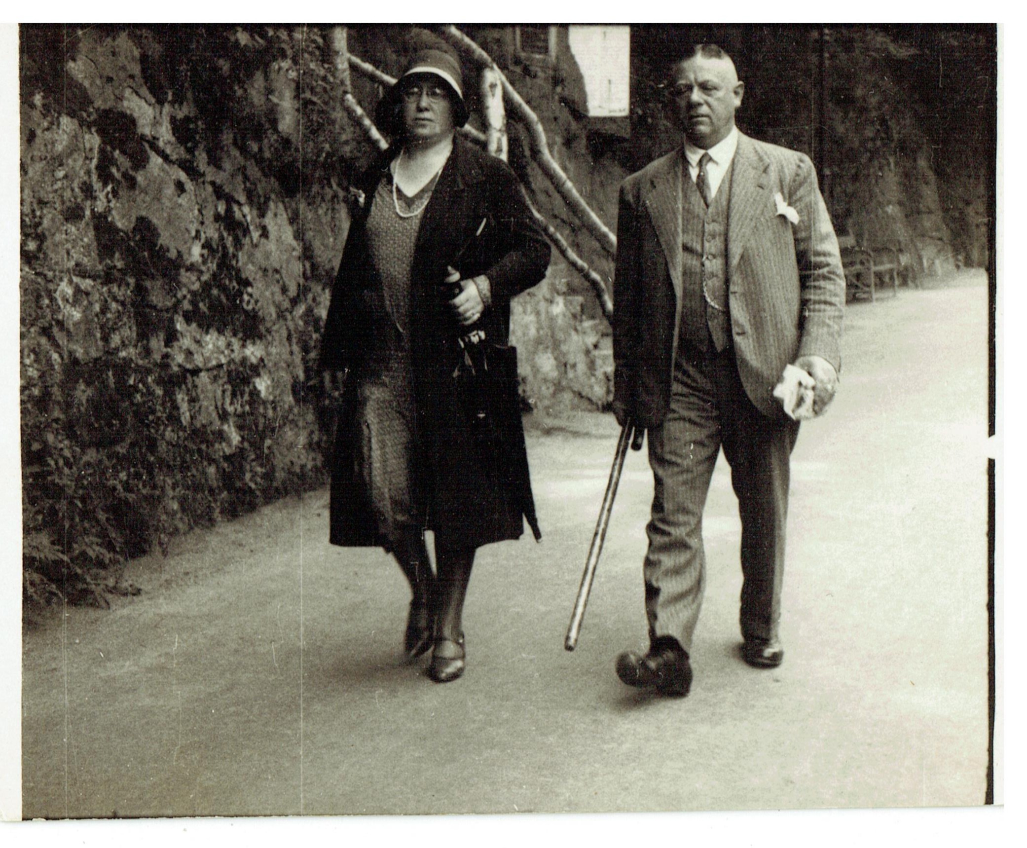 - Man and woman walking man is holding cane and woman is holding an umbrella