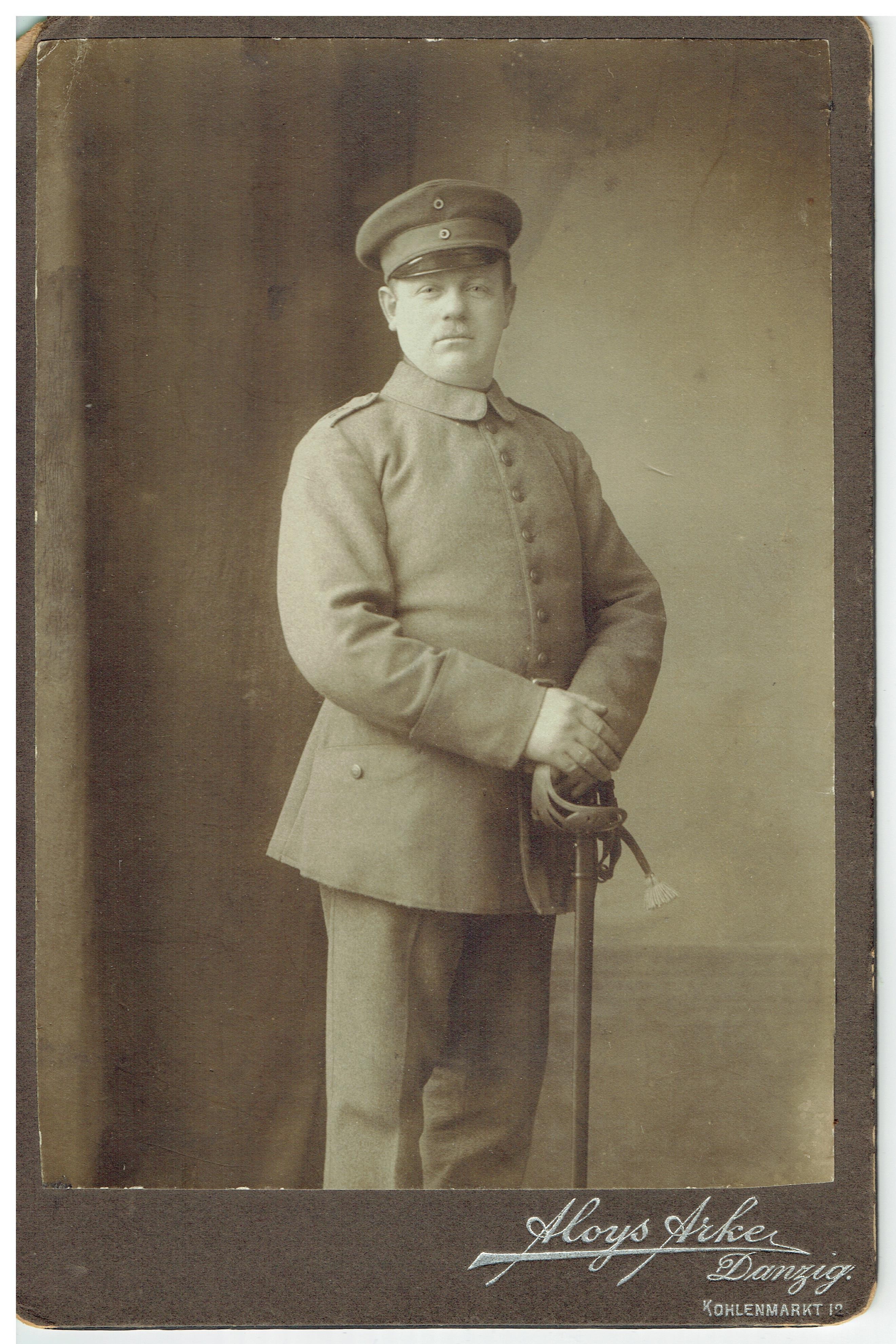 - Julius Lisser in a army uniform posing for a photo'; On the lower right corner the photo has the name of the developer 'Aloys Arke' and location Danzig