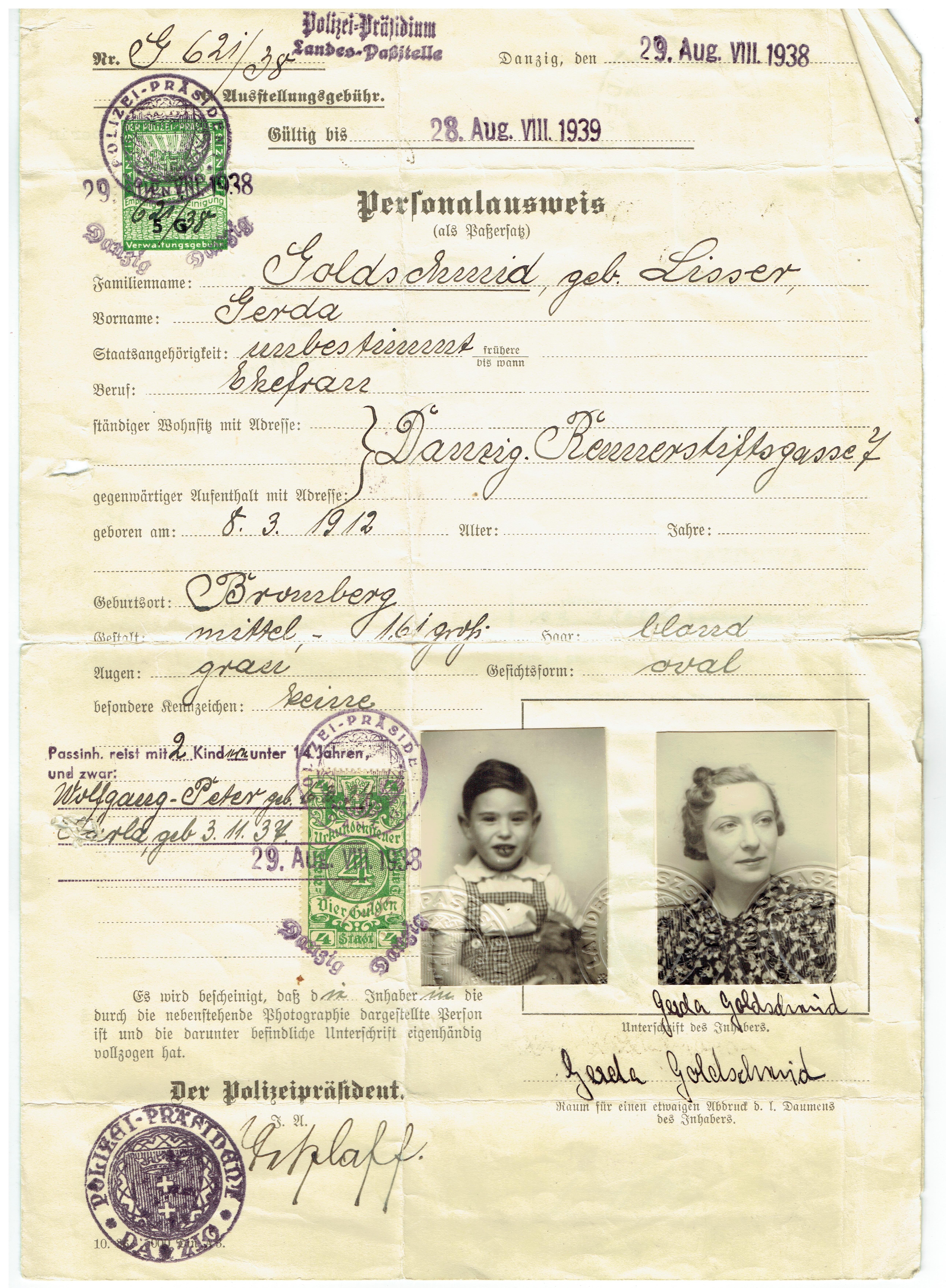 - Government Document written in German from the city of Danzig; ID for Gerda Goldschmid; includes photo of Gerda and a young Peter