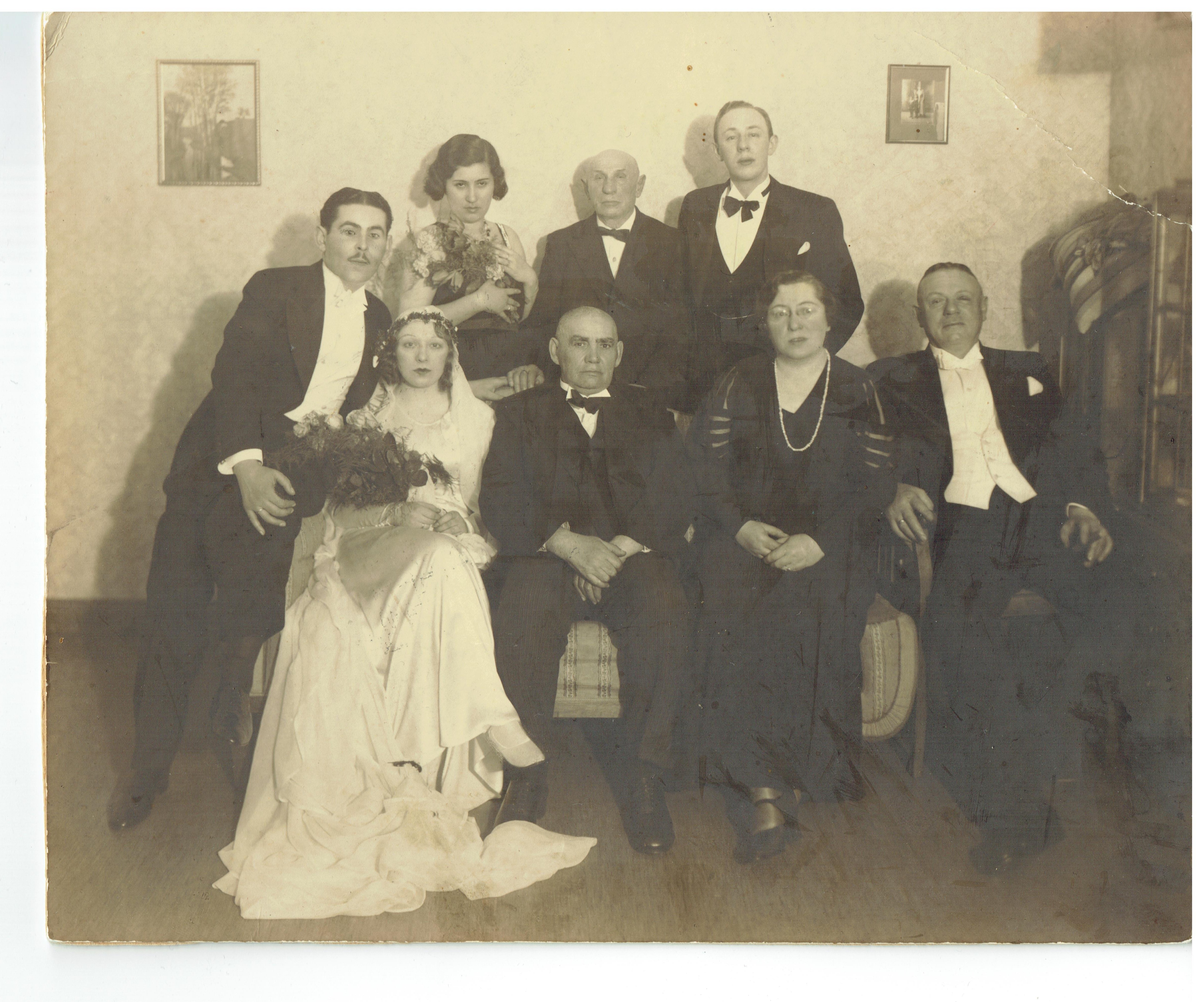 - Photo of a family at a wedding; From top right and clockwise: Martin Lisser, Julius Lisser, G. Lisser, M. Goldscmid, Gerda Goldschmid, Leonhard Goldschmid, Therese Lisser???, Unkonwn??