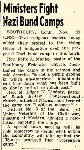 - Published in the Waterbury Democrat, this article follows the ongoing tensions between Southbury residents and the presence of the German American Bund in town. Tensions hightened the winter of 1937 as the Bund increased their activity in the area. Two ministers, Rev. Felix A. Manley and Rev. M. Edgar N. Lindsay stood up against the German American bund. This article also previews the special town meeting held on Nov. 23, 1937 to discuss the proposed "Nazi recreation camp."