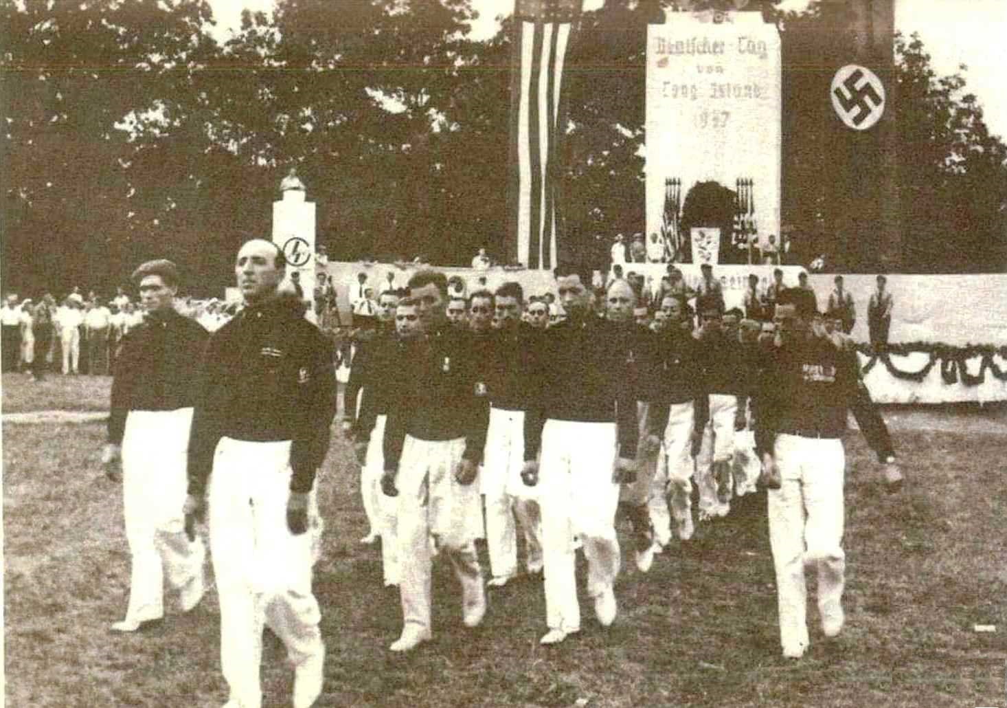 - A dozen older boys march in Blackshirts uniforms as a part of a camp excersise at Camp Siegfried.